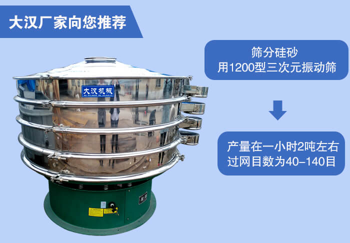 近期有客戶詢問我們銷售客服問篩分烘干后的硅砂產(chǎn)量在一小時(shí)2噸左右,過網(wǎng)目數(shù)為40-70目、70-140目適合用什么型號的振動篩,小編根據(jù)客戶所篩分的物料與過網(wǎng)數(shù)目和產(chǎn)量推薦使用1200型三次元振動篩
